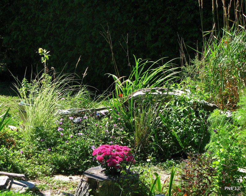 Foliage and Flower here is important. Cardinal Flowers [Lobelia Cardinalis], Dwarf Delphinium ‘Diamonds Blue’, Cosmos, Wild Spotted Knapweed [Centaurea biebersteinii], Mountain Bluets (Centaurea ?], Bee Balm [Monarda didyma], Sundrops [Oenothera Missourensis], Native Blue Flag Iris, Common Iris’, Daylilies, Native Reed Grass, and of course a pot of Fuchsia coloured Mums all give the area subtle punchs of colour. In the second picture down the Papyrus in the ponds is called Cyperus papyrus ‘King Tut’. Foliage varies, and that variation is key to adding interests to the area as a whole.