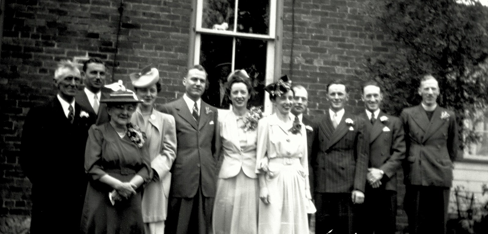[in the photo – L to R – Great Grandpa and GrandmaC, in behind them my GrandpaD, Aunt Jo, Uncle Burt and Aunt Lex (the bride and groom), GrandmD of course front and centre, no idea who that is over grandmaD’s shoulder, but beside him is Uncle Jack, and the next are also unknown, but I assume the guy with the collar was the minister]