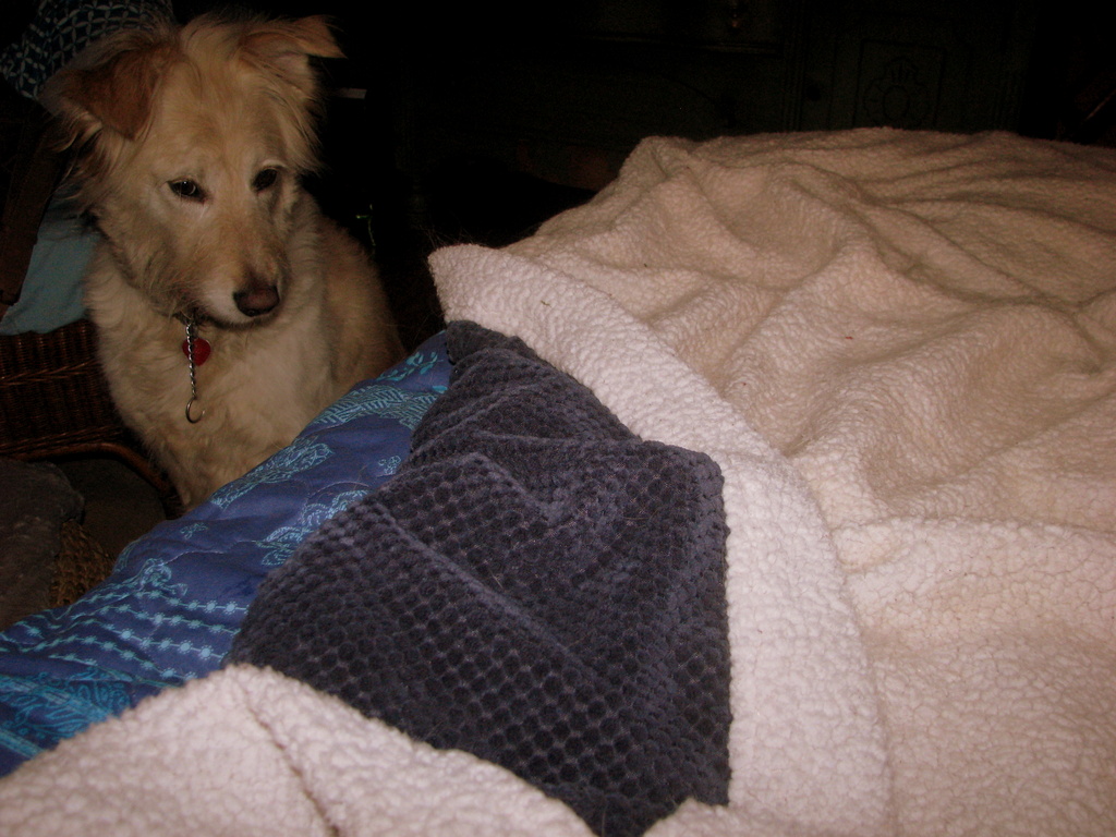 The precious Christmas bone has been placed on the bed beside me, after some careful consideration of other locations. For her last choice, I watched her for about 2 or 3 minutes trying to conceal it under this blanket I have draped over my Ikea wicker thingy. I finally decided I’d tell her, um … “Irish, no doggies are coming in here to steal your bone. Really“. So, I guess she thought “fine than, I’m leaving it here beside you… if it is not there when I get back in, it will be your fault“.