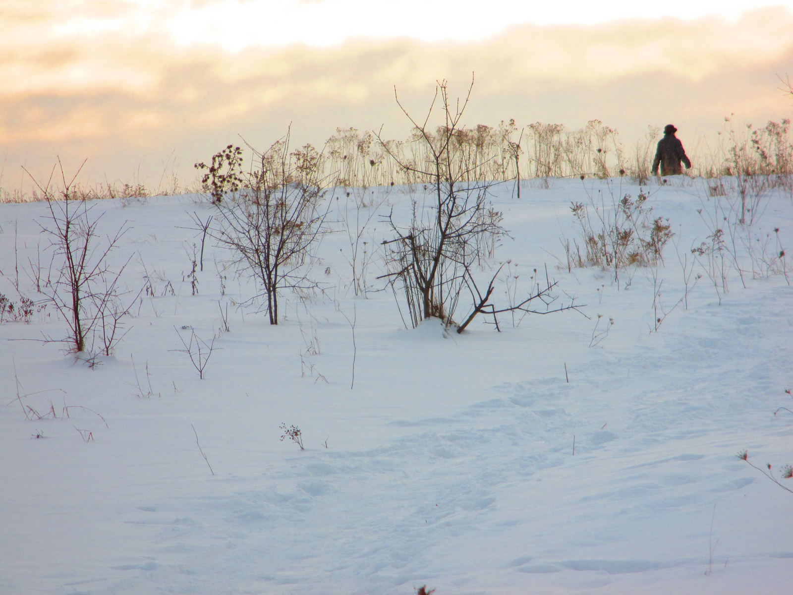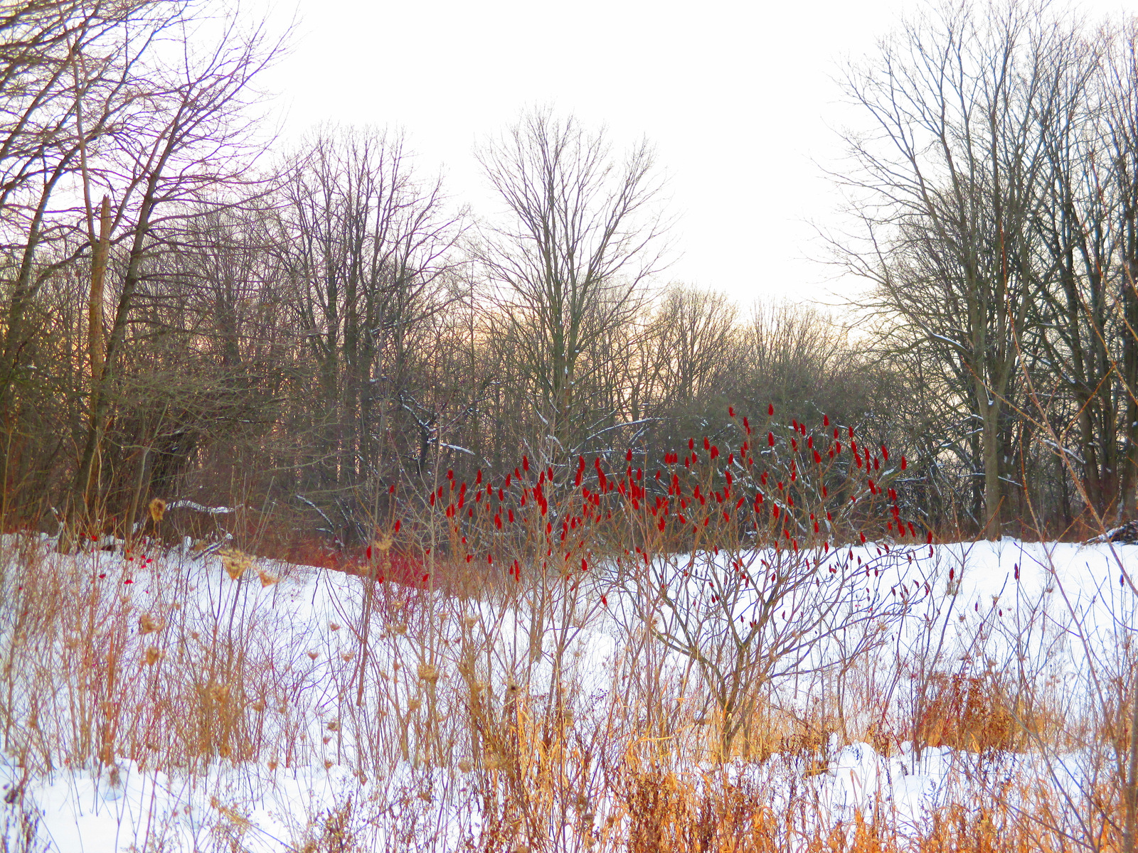 It is a REAL meadow. With dead stalks of wildflowers, grasses and native trees. Sumac and Maples, Cedars, Spruce, graceful Willows and such ring the periphery of the one end. Given the time of year, and given the proclivity for coyotes in this urban area, and given the dream I remembered for the first time in ….em…a few years I think…I decided it best to stick to the meadow proper.