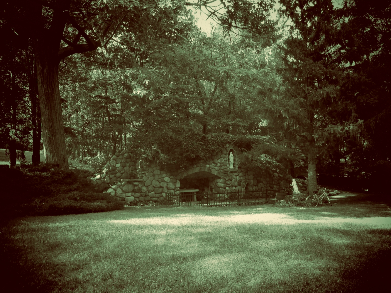 Actually, Mom, I was all set to go. Had gone for a bike ride in the afternoon, and was going to call her by 5 to let her know. I had no particular place in mind to go, and ended up at The Mount. Walked Rose across that steep terraced lawn, towards the Grotto, toward Mary.