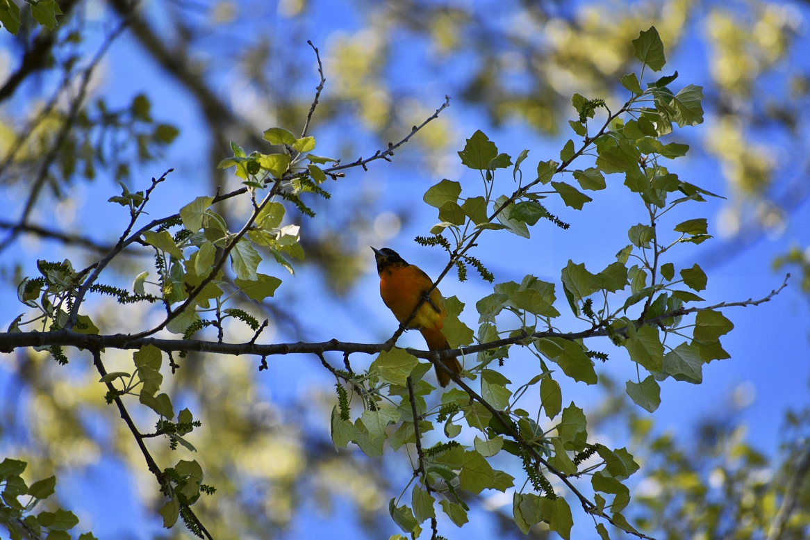 So I winded my way back the same way I had come, but this time at a much slower pace, gazing up at the trees, listening to bird song and one by one they appeared. I went all along the river bank path as it winds back downtown, and ended my ride down at the forks of the Thames, and there, way up, was a Northern Oriole.