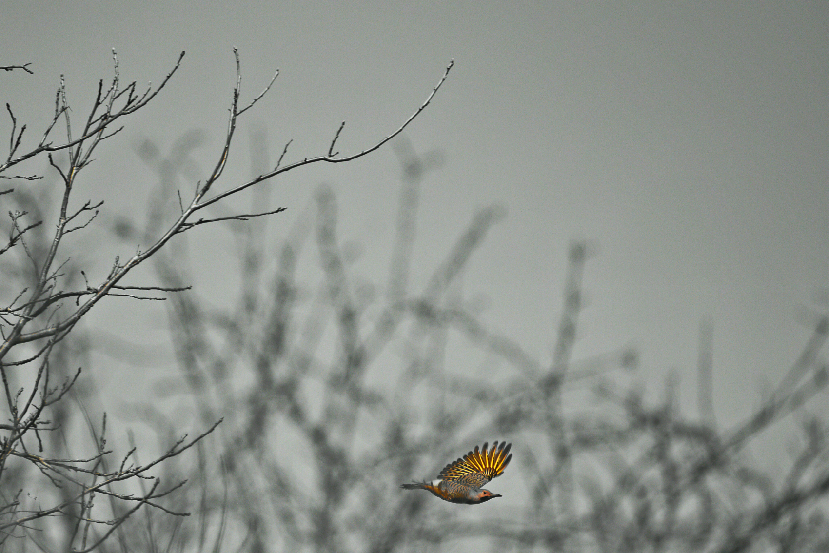 As we proceeded down the path, keeping the colour isolated on the gold of the Willows, and out of the corner of my eye I caught something Golden in the trees. I turned my camera towards the place where I saw the flash of gold and snapped a couple quick shots, thinking it unlikely that I caught it in time.