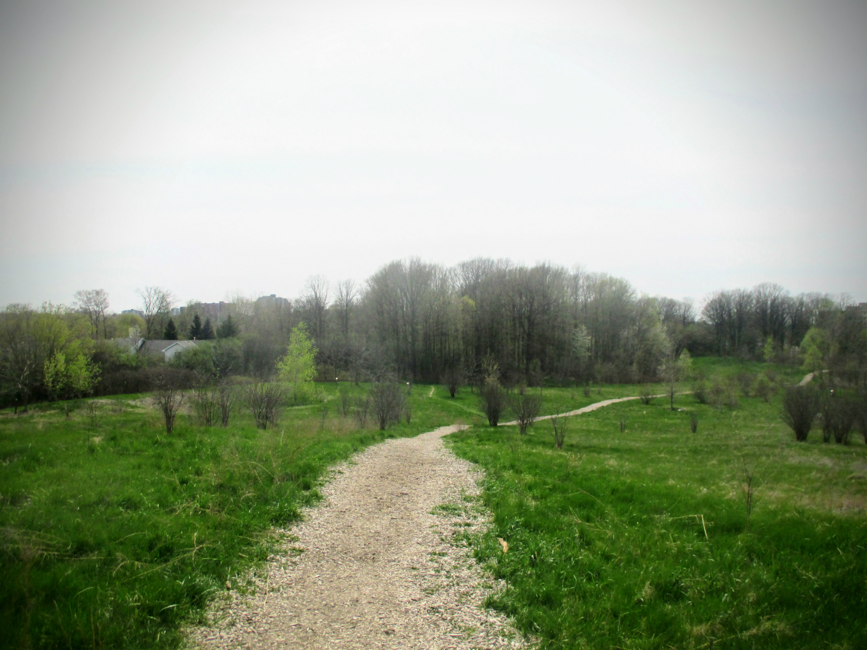 Down the sidewalks of the village, left and then a right, and left, wait for the light and then we cross the busy road. Almost there, almost. We pass the daycare, and ahead I can see the green.