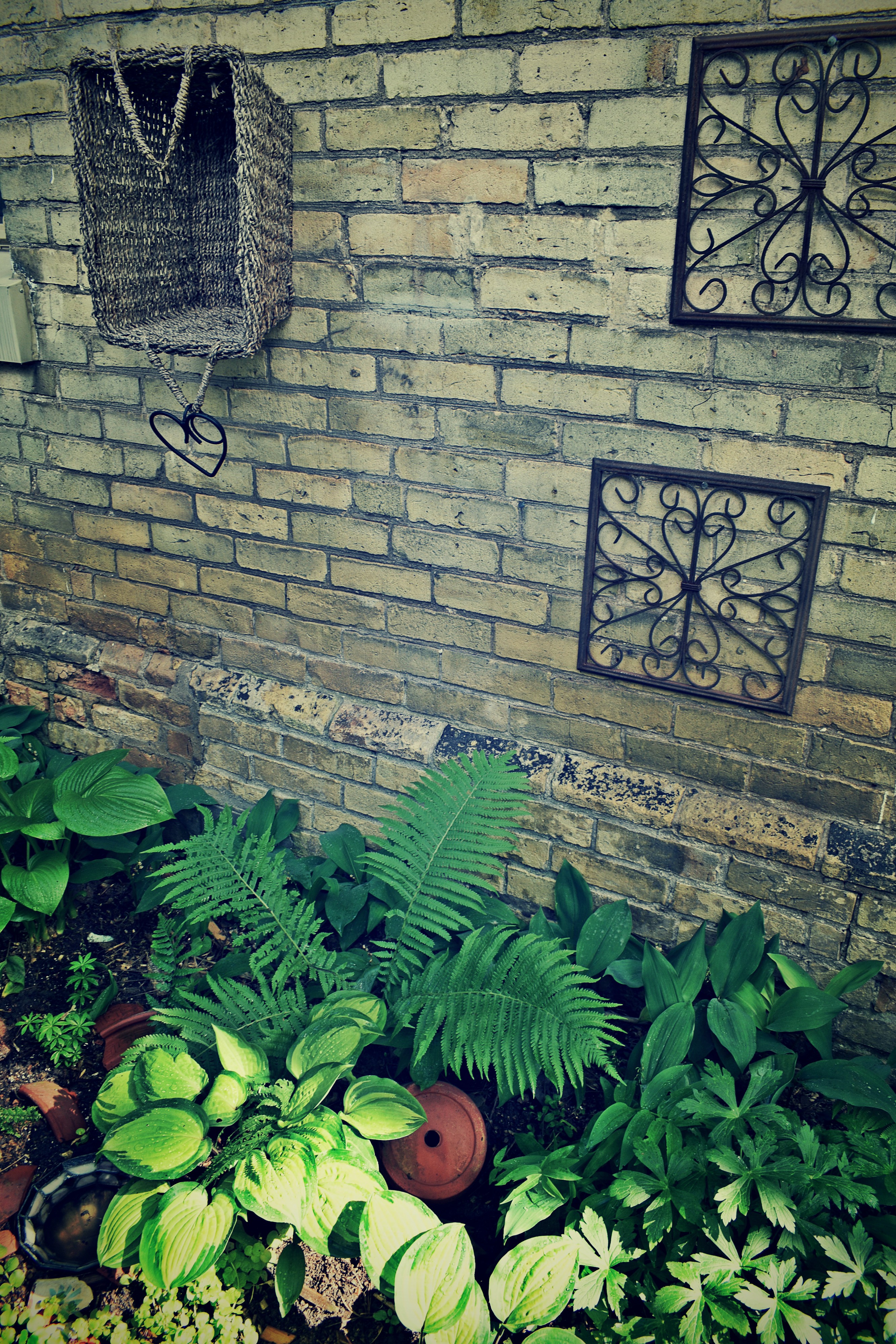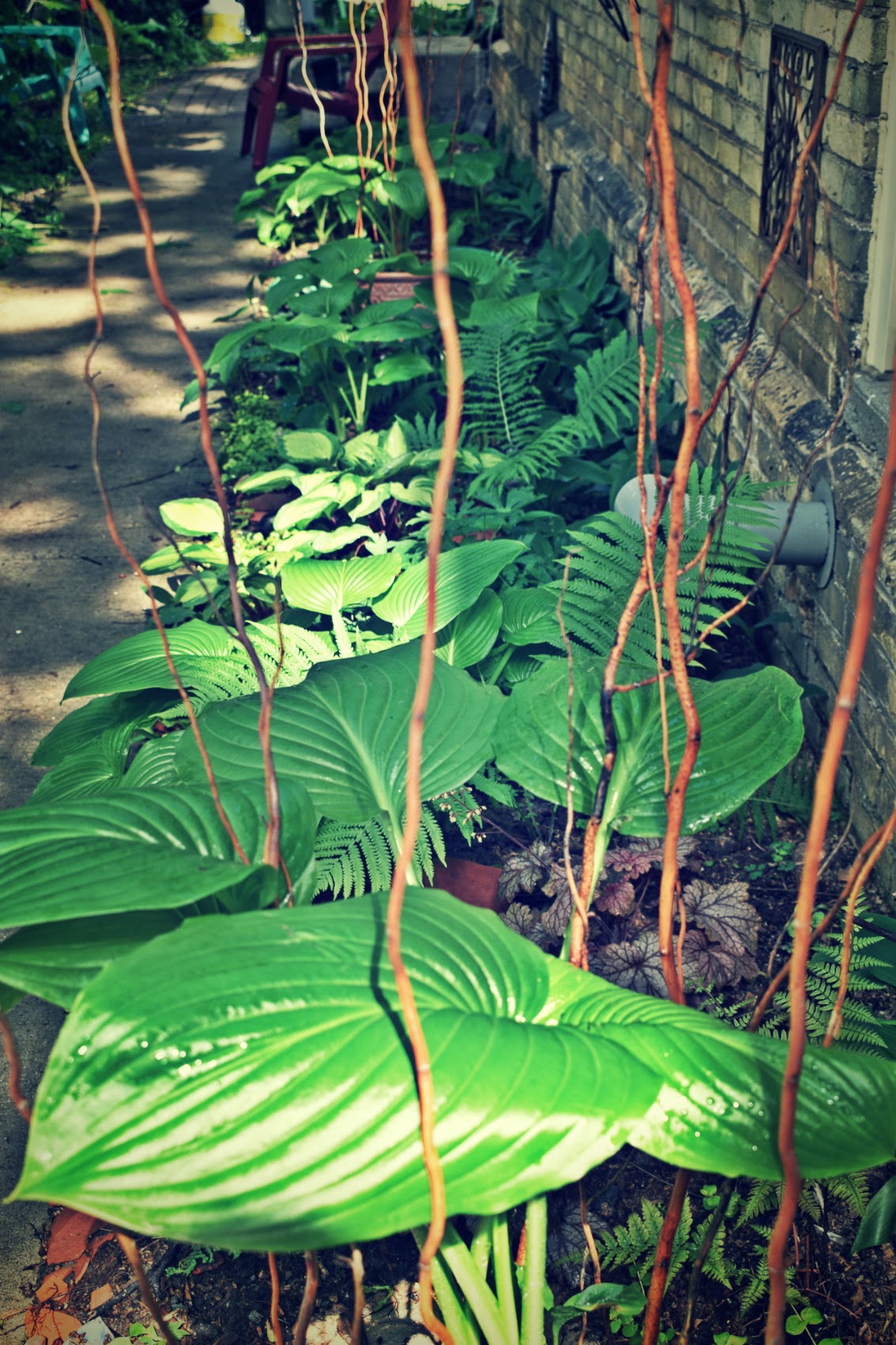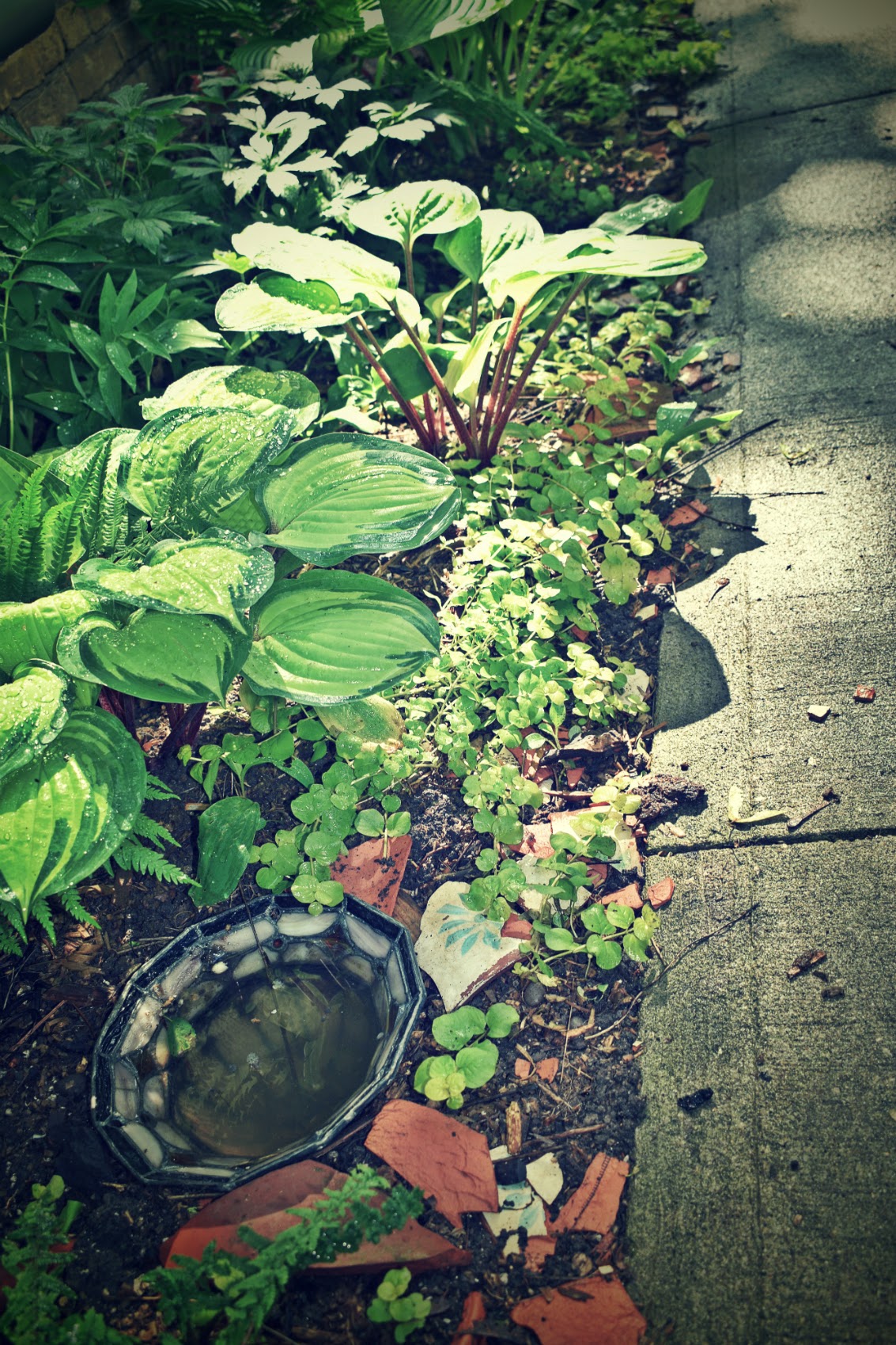 Taking this between space from the nothing that once lay out my door almost 5 years ago, with lessons learned on borrowed time at the cottage, and that long-ago garden I owned, oh, what, 25 years ago when I was married, and unhappily so; and, this one I merely rent, and maybe that’s why it feels different. Lately, I find myself sitting for hours watching the shadows and hues, of the dark rich dark emerald-green of the cedars, to the kelly green of the hostas, the chartreuse of the Creeping Jenny, the peachy bronze of the Coral Bells, the ferns unfurling, and loving every minute with each and every one. With the birds flitting in for visits to the posh Tiffany watering hole, splashing in the square plate, bugs and other creatures mooching about.