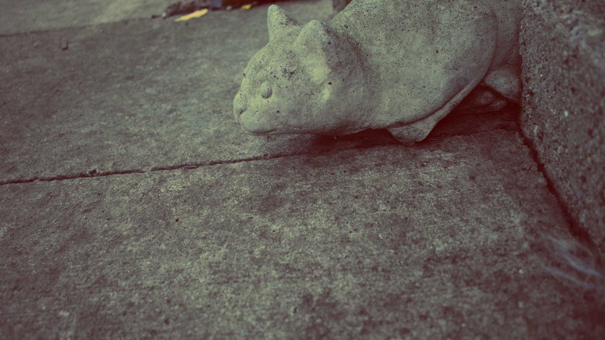Old plumes of the Ostrich Ferns have gone rusty and the Lady’s are coming into their own, as Ginny scrambles all about, a hedgy border here, a sturdy wall of her to block my nook from prying eyes, and the undulating lines of the dead cedars draw me in, spellbound to the dancing fey light through the Japanese Blood Grass that I have longed to see, and there it is before me, with the cement Gizmo at my feet, and I feel blessed.