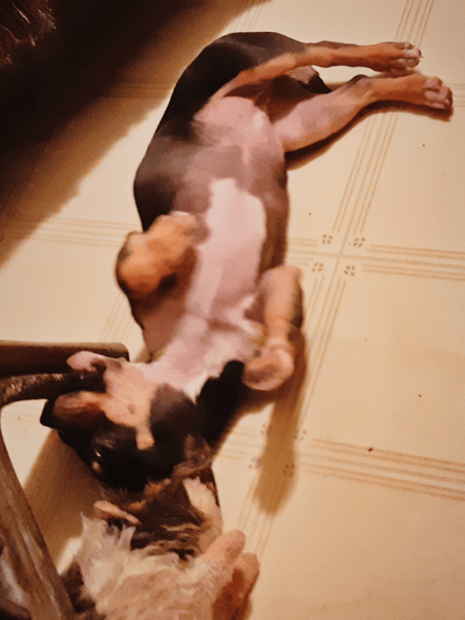 So, I can say she is getting the idea. She does seem to understand NO, though not absolutely 100%. She gets the concept behind OW, and she is modifying her bites, just like the guy in the video said, which is a win. Though still my arms look like I have some kind of rash that’s healing, still, a win.