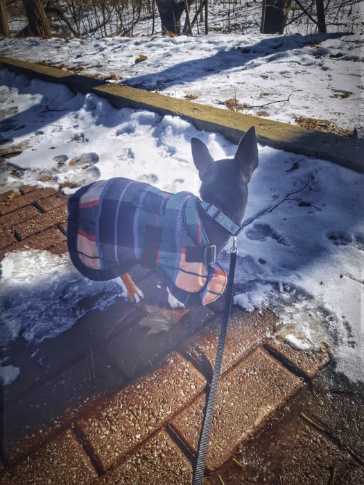 Got her new winter gear, so, a tiny Japanese Warrior, or like she’s wearing a poofy 80s placemat?