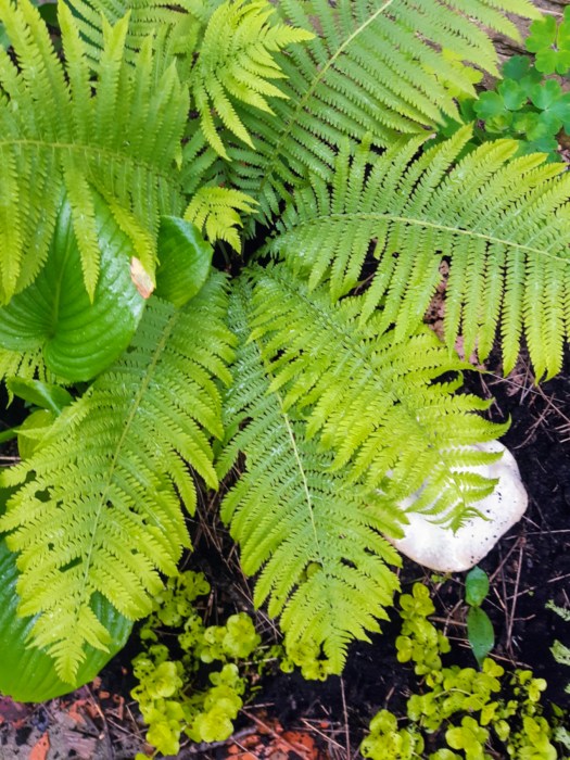 I guess they are called Ostrich Ferns, and they need to have their feet wet always. In the spring they are beautiful, the plummy fronds swaying in the spring shade. Yet, by summers heat they wither and begin to fade, and I have to make sure they stay wet and cozy here in my little garden between.