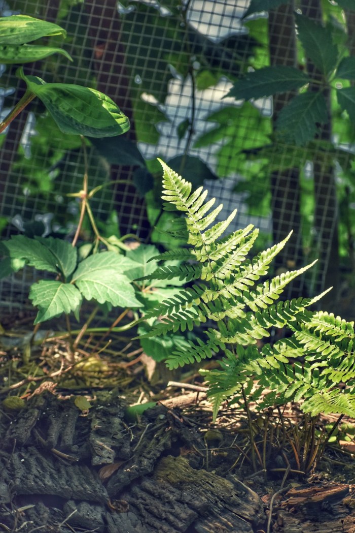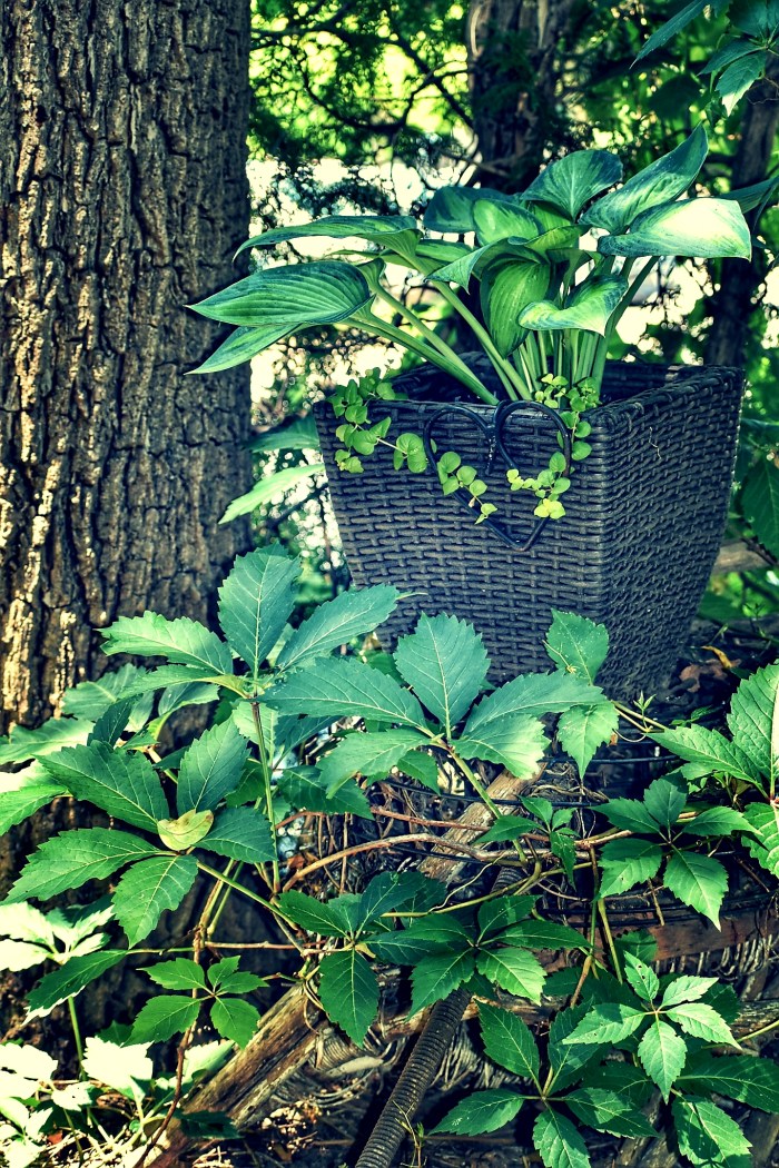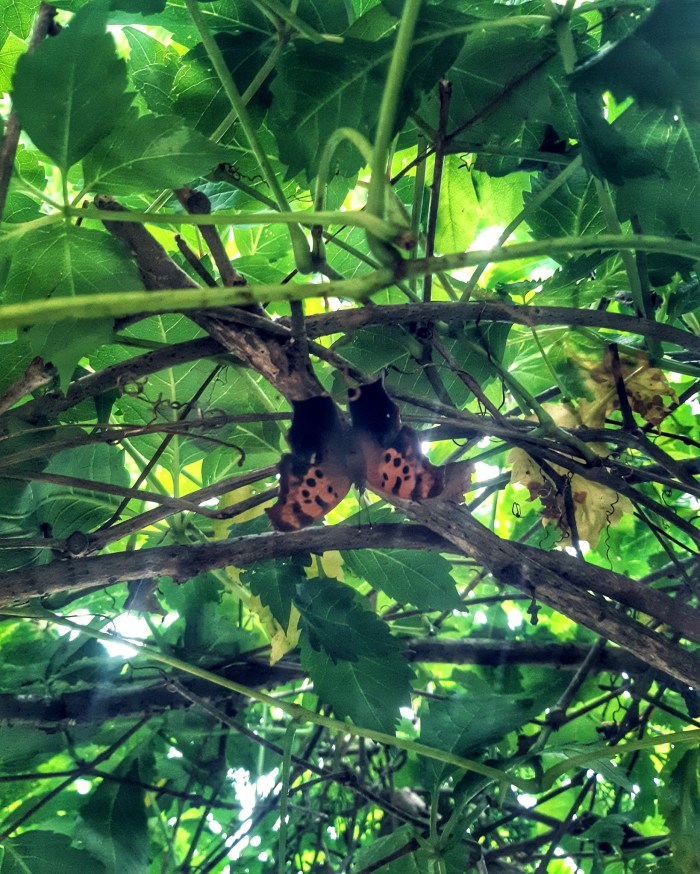 So, plenty of space for doing doggy stuff, like lying in the dirt, hunting ants, watching squirrels taunt her, head cockeyed at the House Sparrow hopping by to the little watering hole I made for them with a clear glass Pyrex lid. Awe struck by the couple chipmunks scampering thru the garden, wide-eyed and alert, stunned, long after they had disappeared under the fence. Watching in awe as butterflies flit by, and rest in the shade of the Virginia Creeper.